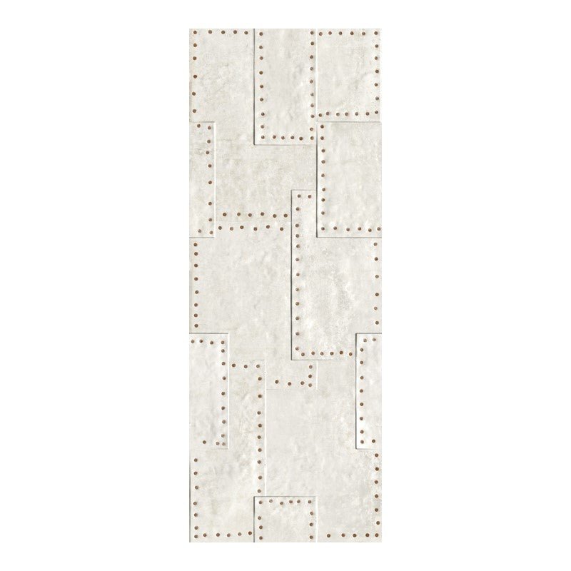 Industrial look 18x47 white ceramic wall tile with nailed metal plate pattern. 18 tile faces. Rectified ceramic tile from Spain with matte finish for industrial chic or modern industrial commercial and residential projects.