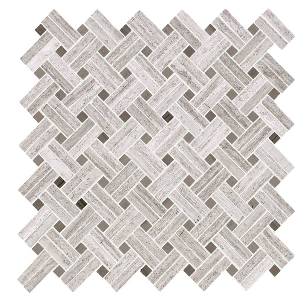 Wood grain marble mosaic tile in intricate 1/2 x 2" basketweave strips pattern with Athens Grey marble accent squares.