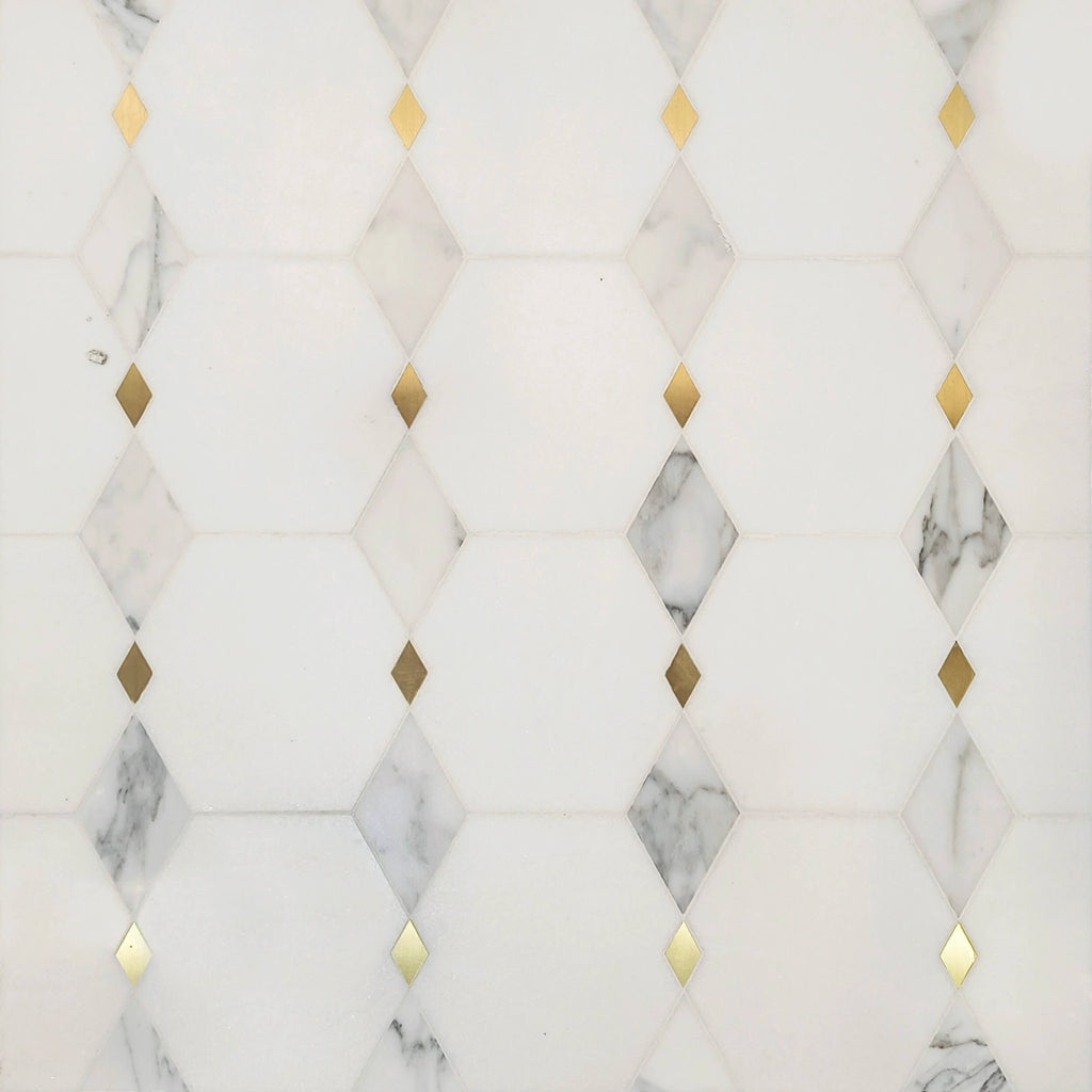 Calacatta & Brass Waterjet Mosaic Tile in Falling Diamonds