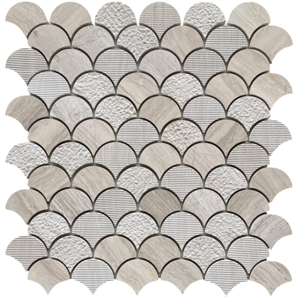 Wooden White marble mosaic tile in classic fish scale scallop fan pattern. Mix of smooth and textured fan shaped chips with matte finish. Elegant greige textured fan mosaic tile for walls and floors. This pattern is also available in Carrara White.