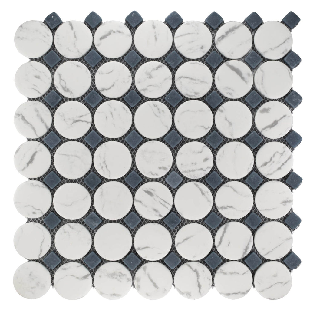 Timeless Carrara marble look white and gray glass large penny round mosaic tile accented by small dark blue square shaped diamonds. Matte white and gray glass circle round mosaic tile with blue dots.