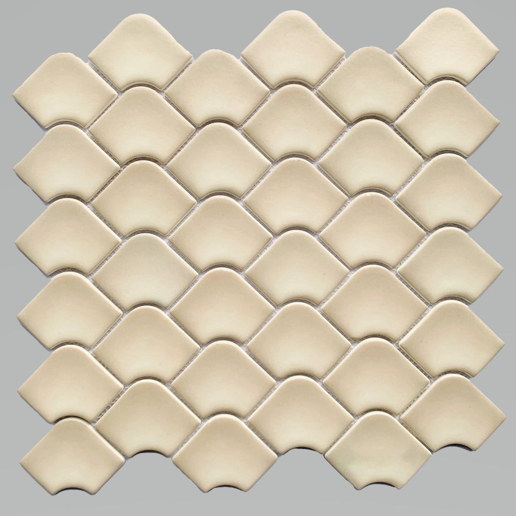 Short fan or fish scale shaped beige and taupe wall tiles provide a clean, contemporary look that's perfect for a modern kitchen or bathroom backsplash. Other ideas include walk-in shower or tub surround, bathroom accent wall, tiled shower niche, and border tile.