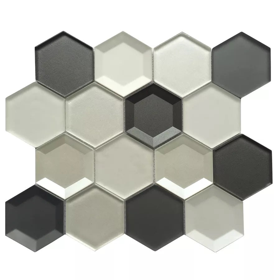 3D hexagon glass mosaic tile in neutral modern colors. Modern 3D look mosaic tile with mix of black and grey/greige hexagons.