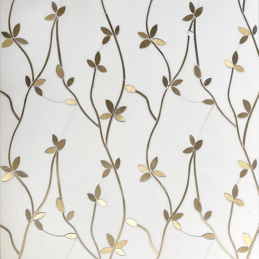 Interlocking vines of brass flowers set against a backdrop of bright White Thassos marble from Greece. Floral brass and white marble waterjet mosaic tile, inspired by spring. Marble tiles with brass inlay can be used to create a glamorous, luxe bar backsplash, kitchen backsplash, or accent wall.