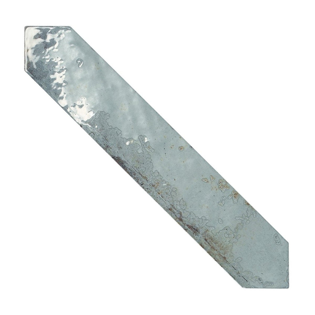 Distressed metal look ceramic picket tile for walls in glossy pale aqua blue. Distressed aqua 2x10 picket tile with glossy finish for rustic, farmhouse or industrial kitchen backsplash, shower walls, or tub surround. Designer distressed picket tile from Spain. 24 tile faces per box of 23 tiles.
