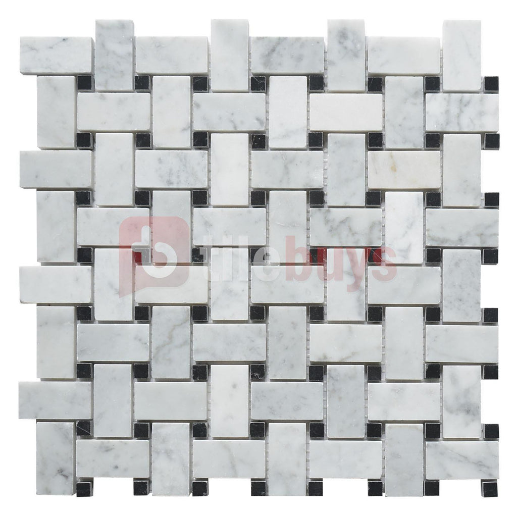 Carrara White marble mosaic tile in 1 x 2 basketweave pattern with Nero Black marble accent dots. Polished or honed finish available. Basketweave Carrara tile for walls and floors.
