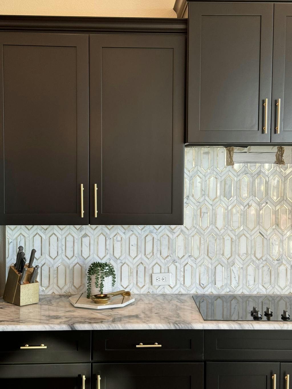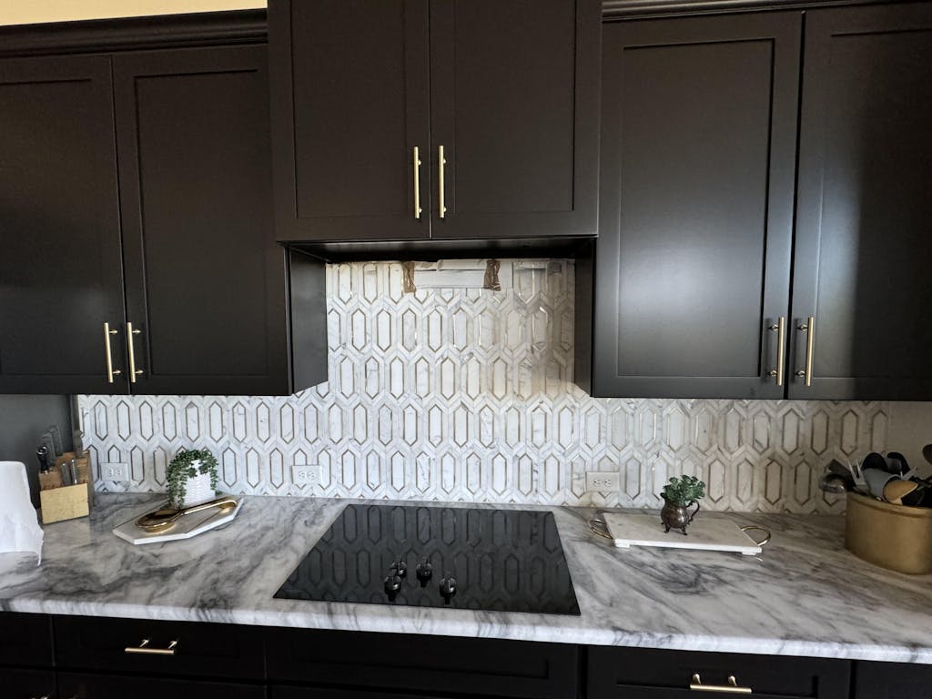 Gold color metal accents bring warmth, light, and a refined sense of luxury to marble mosaics, adding an elevated contrast to white and neutral stones. For this design, the gold accents are made from anodized aluminum, selected for its durability, consistent finish, and modern, polished appearance.