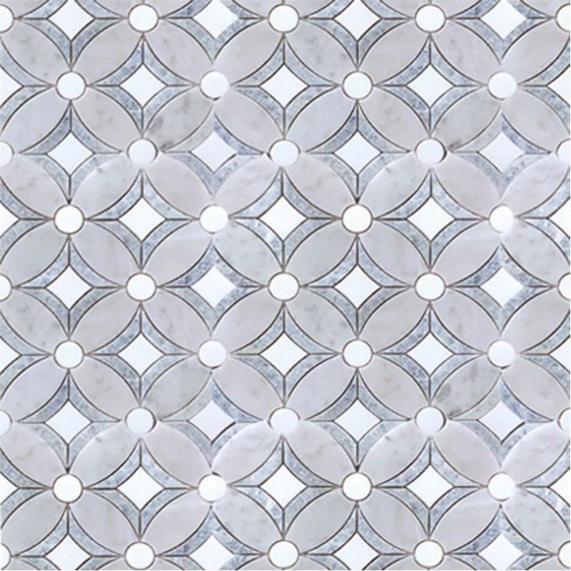 Carrara, Thassos and Argentina Blue Marble Waterjet Mosaic Tile in Tatius