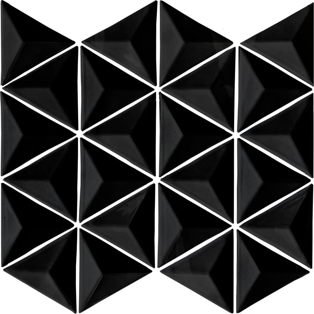 Black glass triangular 3D tile for walls. Glossy black 3D triangle tile for kitchen backsplash, bathroom and shower walls, and tub surround.