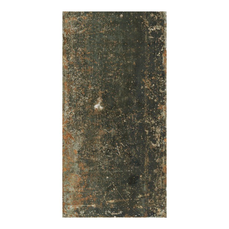 Distressed metal look patterned porcelain wall and floor tile. 19 tile faces. Rectified porcelain tile from Spain with lappato finish. Grunge pattern rust brown and black metallic look floor tile for industrial chic or modern industrial commercial and residential designs.