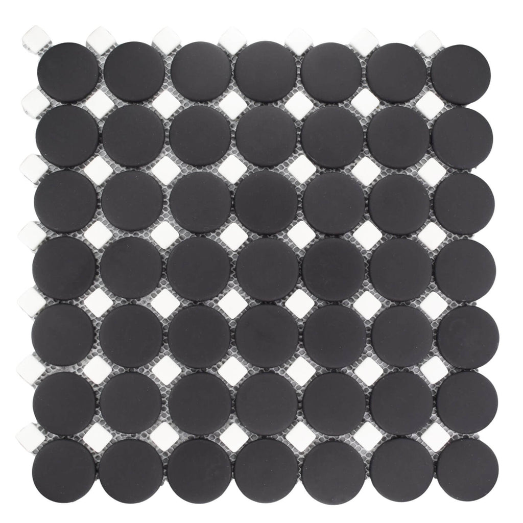 Matte Black Glass Circle Mosaic Tile with White Accent Dot