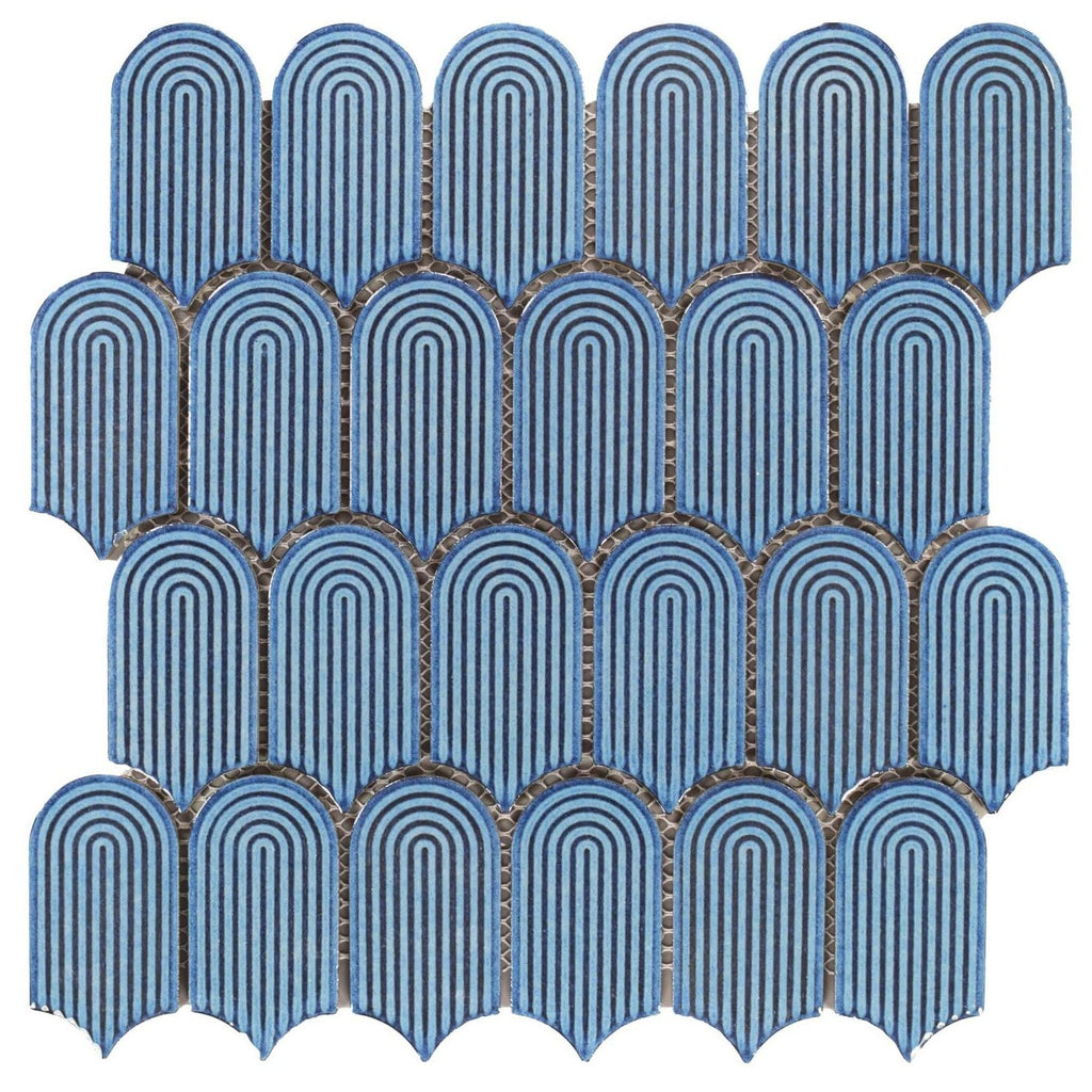 Modern elongated fish scale mosaic tile in matte blue ceramic. Matte blue art deco arch pattern fishscale ceramic mosaic tile for walls. Patterned blue elongated scallop tile for backsplash and accent walls.