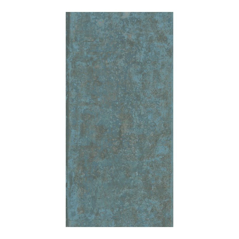 Distressed blue metal look patterned porcelain wall and floor tile. 19 tile faces. Rectified porcelain tile from Spain with lappato finish. Grunge pattern blue metallic look floor tile for industrial chic or modern industrial commercial and residential designs.