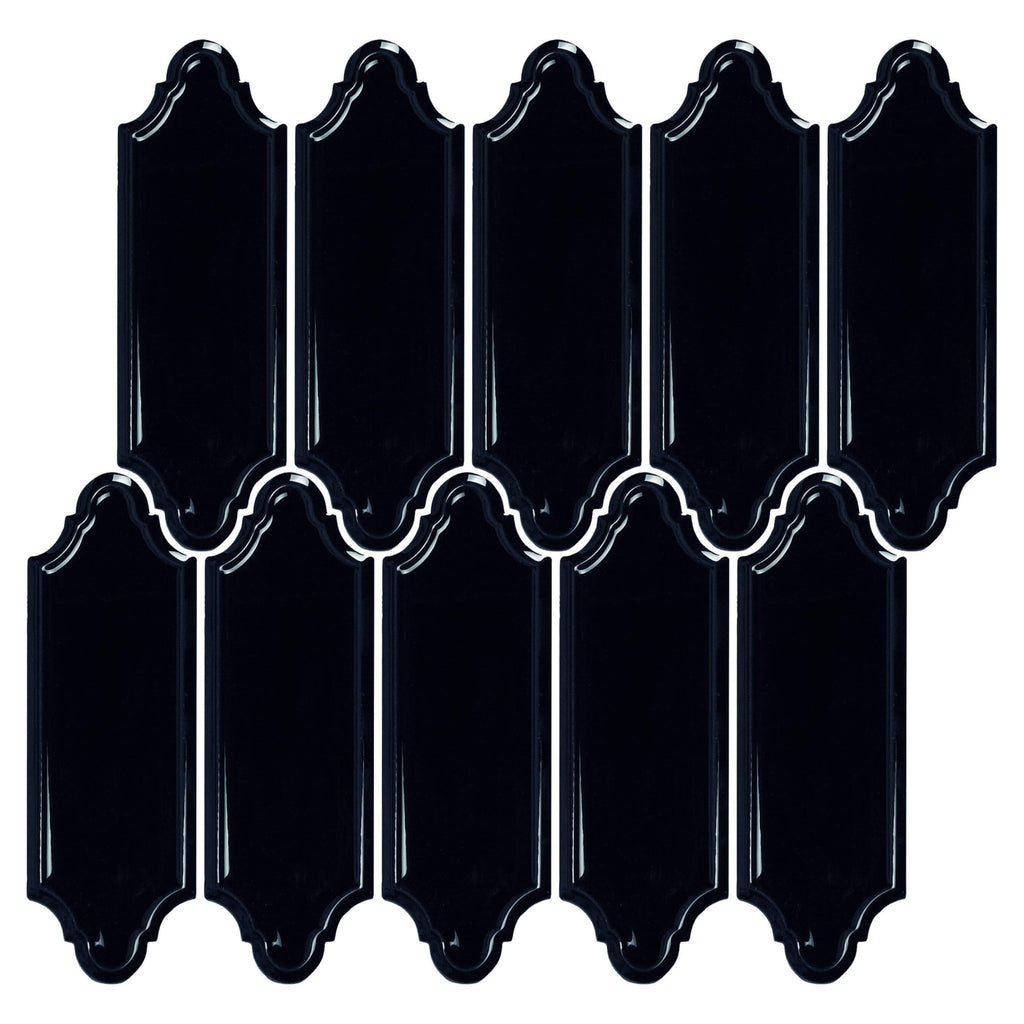 Glossy ceramic linterna (lantern) shaped mosaic wall tile in onyx black featuring ornate curves and vibrant black color. Suitable for backsplash, shower walls, and accent walls. Onyx black mosaic tile backsplash for wall installation only. Imported from Spain.