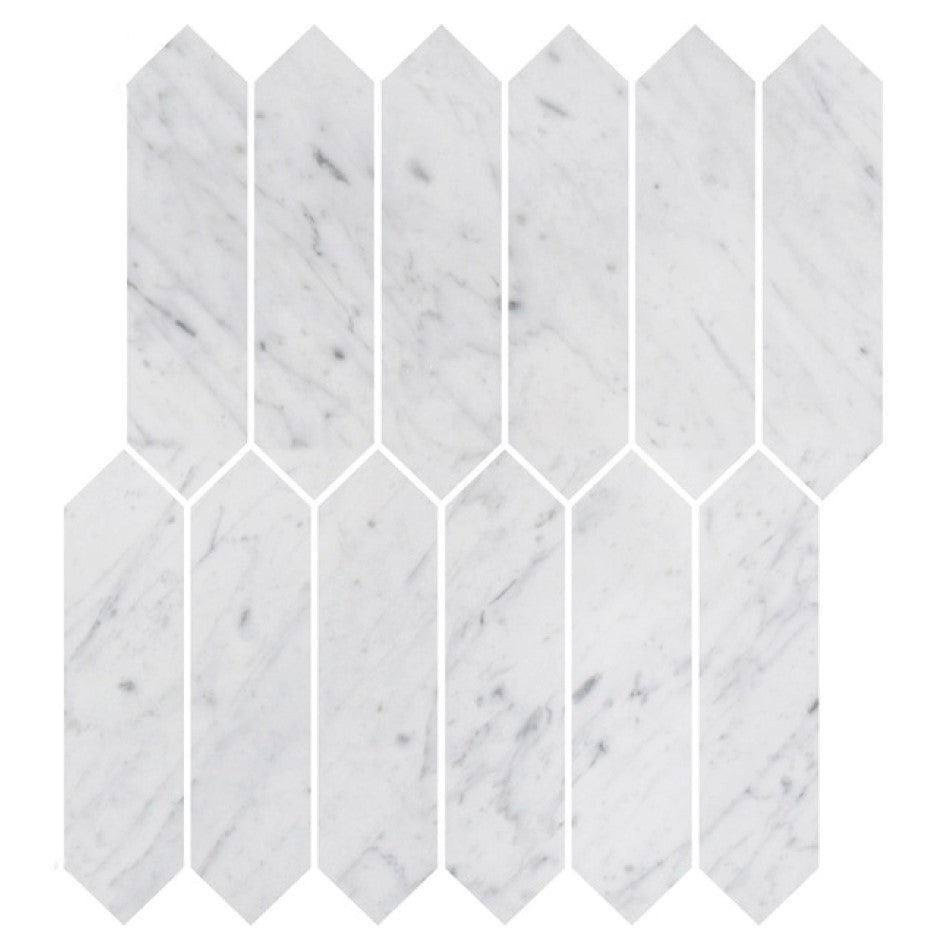 White/Gray Italian marble with distinctive thin black veining in elongated diamond shaped hexagons for a classic picket pattern backsplash, wall or floor tile.
