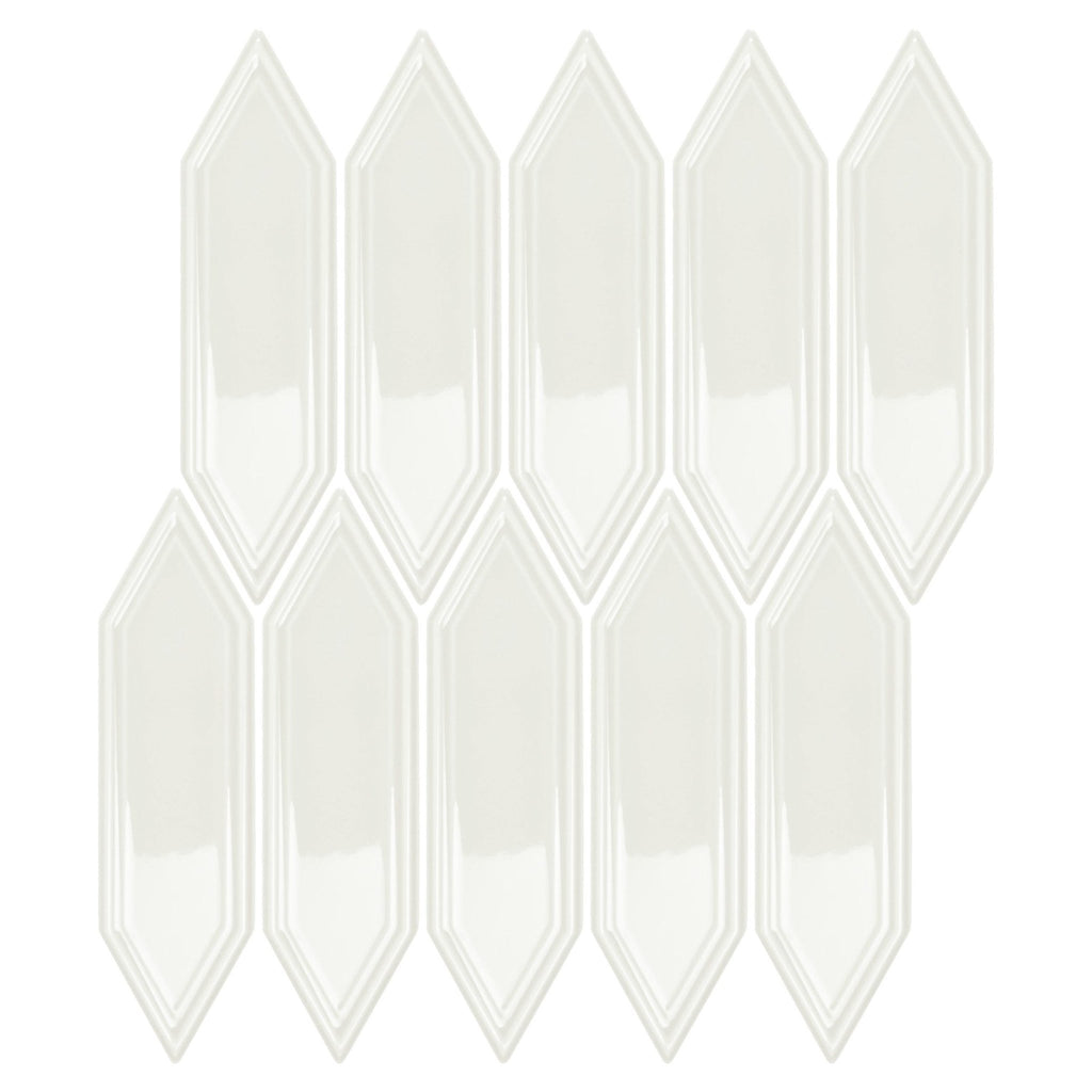 Glossy ceramic picket shaped mosaic wall tile in snow white. Suitable for backsplash, shower walls, and accent walls. Snow white picket tile backsplash for wall installation only. Imported from Spain.